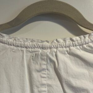 Cute vintage white blouse with ruffled V-neck. Ruched short sleeves add to the details of this crisp shirt. Wear with cut off shorts and a tall cold glass of lemonade!