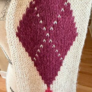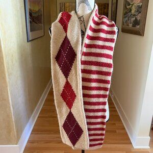 GAP San Francisco California Argyle Alpaca Blend Knit Scarf Reversible. Argyle pattern on one side and stripes on the other side. Soft knit. Burgundy, rust and gold argyle pattern on a tan background. Rust and tan stripes on the other side. Excellent pre-owned condition. No known flaws. No holes or stains. Minor pilling.