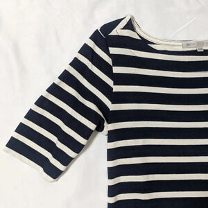 Short sleeve dress with nautical navy blue and off white light cream stripes. Short sleeves, and a little silver zipper at the neck which has a boat neckline. Mini length.
