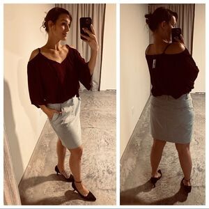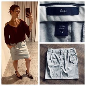 GAP work chic grey skirt with pockets. Size 10 stretch. Gorgeous neutral grey. Optional belt loops. Retro: manufactured in 2010. Excellent condition. Please see photo section for approximate flat measurements + my personal model stats. Note: this skirt is loose fitting on me.