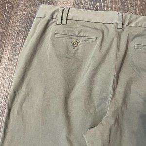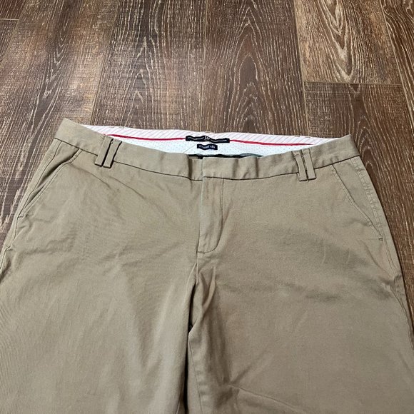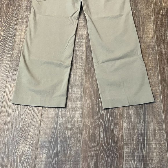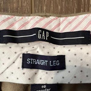 GAP Straight Leg Pants. Khaki. Size 16 Regular. Inseam 29 ½”. 10” rise. 94% cotton, 6% spandex. 3 front pockets and 2 buttoned back pockets. Zip, button and 2 hook closure. No holes, tears, or stains. Still in great used condition. Please see photos.