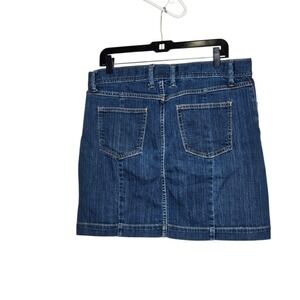 Keywords: denim skirt, mini skirt, gap skirt, stretch denim, dark wash, casual skirt, women's skirt, size 12, a-line skirt, five pocket, jeans skirt, blue skirt, classic, comfortable