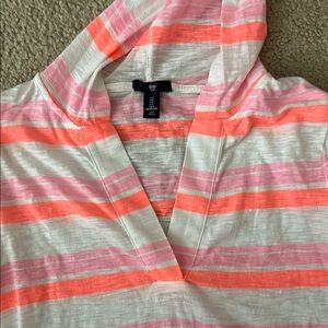 Stylish hooded top with pink and white stripes. Features long sleeves and drawstring details. Perfect for summer! Super cute white orange and pink. Great for the beach towns! Like new condition!!