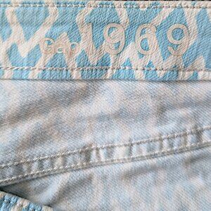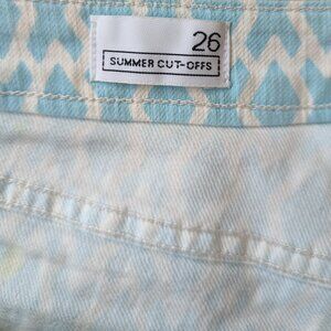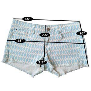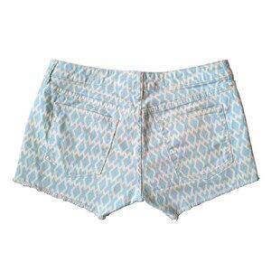 Gap Summer Cut-Off Shorts in their dockside blue colorway, a light blue and white geometric pattern. Denim jean material with frayed hems and some stretch. Front and back pockets, belt loops, zipper fly with button. Size 26" waist (equivalent to a 2). 98% cotton, 2% spandex
