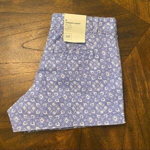 GAP summer shorts in a bold blue and white laser print. Classic mid-rise fit with button/zip closure, belt loops, and pockets. Lightweight and breathable — perfect for warm weather, vacations, and casual everyday wear.