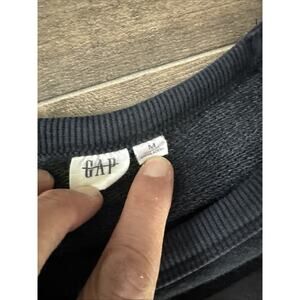 This GAP sweater is a men's size medium in solid black with a gray Gap logo accent. It features a crew neck and long sleeves, made from a blend of polyester and cotton for a heavyweight feel. The design incorporates a retro USA Y2K vibe, making it a stylish addition to any wardrobe. Made by Gap in Bangladesh, this pullover sweatshirt offers a regular fit for comfort and versatility.