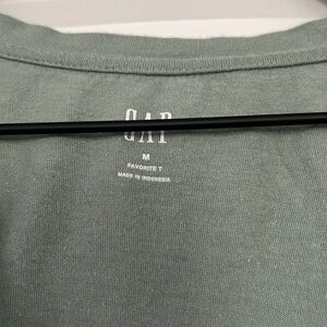 This GAP t-shirt features a classic v-neckline and short sleeves, crafted in a soft, vintage-textured fabric. The muted green color adds an earthy touch, while the subtle speckled pattern offers a unique style.