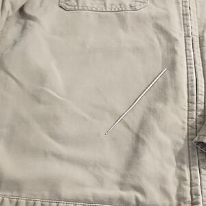 The GAP Tan Lightweight Utility Jacket features a relaxed fit and minimalist design, ideal for layering in transitional weather. Made from a comfortable cotton-blend, it embodies a casual workwear aesthetic with versatile style.v Extra Button, 2 chest pockets, 2 hand pockets. Very cool jacket