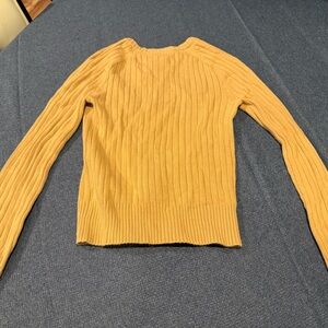Classic tan ribbed cardigan. Features a full zip closure. The color is more accurate in the second picture. Tight fitting