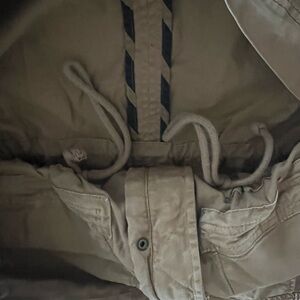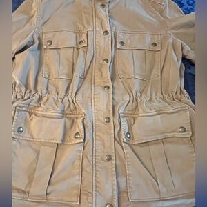 Stylish women’s tan GAP utility jacket. Features multiple cargo style pockets. Button-up and zipper front. Perfect for casual wear. Able to cinch waist on the inside with ties on both sides. Great condition! Smoke free/pet free home.