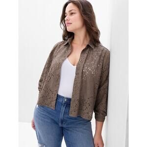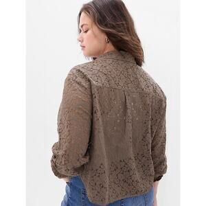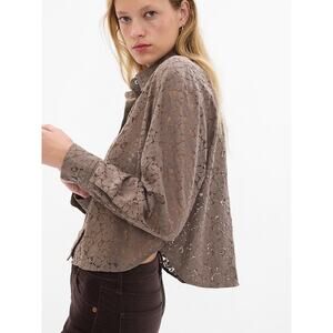 This cropped lace blouse from GAP combines feminine charm with modern versatility. Crafted in a delicate taupe lace overlay, it features a collared neckline, long sleeves, and button-front closure. The cropped length hits above the waist for a flattering, on-trend silhouette that pairs beautifully with high-waisted jeans, skirts, or trousers. Lightweight and slightly sheer — perfect for layering over a camisole or bralette.
