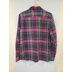 The GAP UNTUCKED Flannel Men's XL Button Down Shirt in Green and Purple Plaid is a versatile and stylish addition to any man's wardrobe. Made from cotton flannel, it offers a relaxed fit and long sleeves, making it perfect for various occasions such as casual outings, business meetings, or even a party. The modern design with a collared neckline and button-down closure adds a touch of sophistication to this classic piece, while the multicolor plaid pattern adds a touch of fun. Perfect for all seasons, this shirt can be easily styled to suit any style or event.