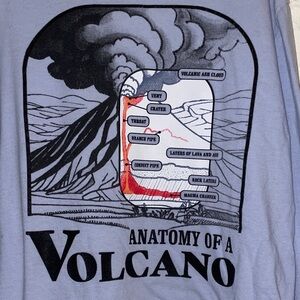 Light blue long sleeve tee with Anatamy of a Volcano graphics