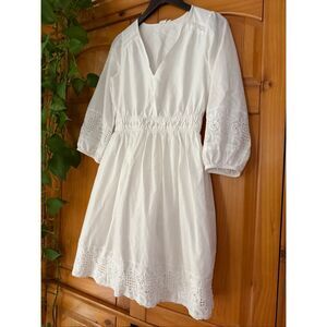 Beautiful white GAP dress in size Small, featuring delicate eyelet embroidery on the sleeves and hem. Made from 100% cotton with a soft cotton lining, this dress is lightweight, breathable, and perfect for warm weather. The elastic waist creates a flattering shape, while the V-neckline and slightly puffed 3/4 sleeves add a feminine, boho touch.