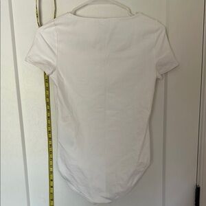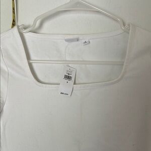This sleek white bodysuit from GAP features a fitted design with short sleeves, offering a clean and versatile look. Made from a stretchy material, it ensures comfort and a flattering fit. The snap closures at the bottom add practicality to this essential top.