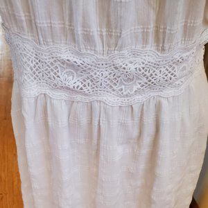 Elegant white maxi dress. Features lace details and flutter sleeves. Perfect for any occasion. 100% cotton.