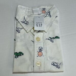 Embrace a playful style with this GAP button-down shirt, featuring a whimsical dinosaur print on a crisp white and green fabric. Ideal for adding a touch of fun to your casual wardrobe, this shirt combines comfort with a unique design.