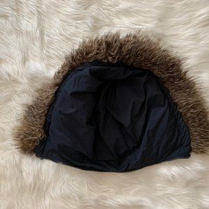 faux fur on hood, removable hood, long. Down filling, 100% Polyester shell and lining