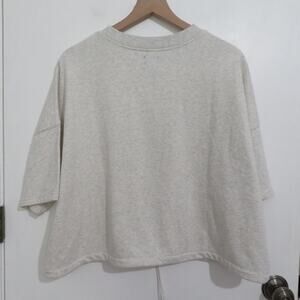 GAP oversized drawstring hem sweatshirt tee in light heather gray. Light heather gray fleece boxy oversized tee. Wide elbow length sleeves, crewneck and adjustable drawstring hem.