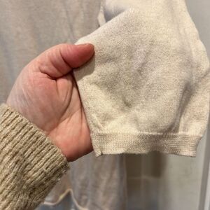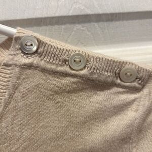 Good pre owned condition. Mild washwear. Cotton cashmere blend. Bracelet length sleeves. Ribbing at the hem. Buttons at the neck.