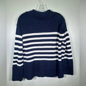 GAP Women's Collared V-Neck Split Hem Navy and White Stripe Sweater Small Cotton