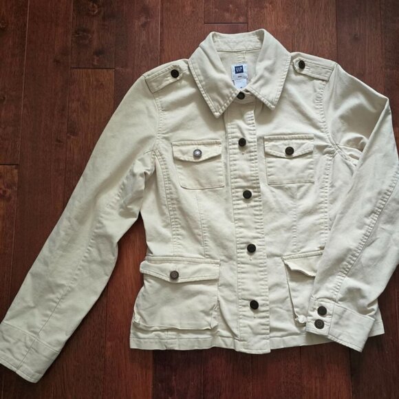 The GAP Denim Jacket in size M for women is a beige button-down military-style jacket that is perfect for various occasions such as travel, casual wear, workwear, and business. Made from 100% cotton with a lightweight design, this jacket features a collared neckline, long sleeves, and pockets. The jacket's Y2K gorp core style adds a classic touch to the wardrobe, making it a versatile and timeless piece for the seasons of fall and spring. This jacket is easy to care for with machine washable instructions, making it a convenient and stylish addition to any woman's closet.