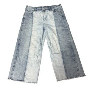 Stylish wide-leg jeans in denim blue. Perfect for casual wear. Comfortable and trendy. Two toned. Raw hem. Zipper and double button closure.