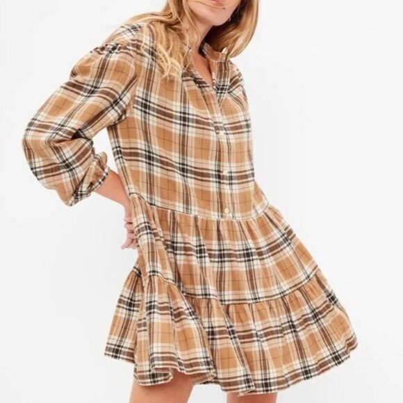 GAP Womens L Camel Plaid Button-Front Long Sleeve Tiered Dress Cotton Comfy Chic