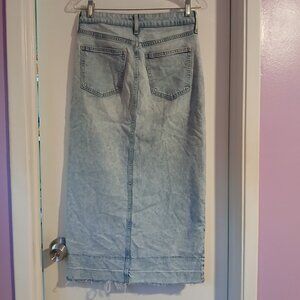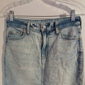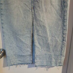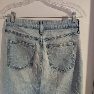 Features: high waist, front slit, raw frayed hem, A-line, 5 pocket style, belt loops, front button and zip closure