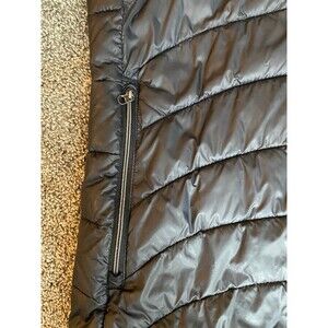 Warm and lightweight long puffer coat from GAP in a sleek black finish. Features a full zip front, zippered pockets, and a cozy hood for added warmth. Perfect for fall, winter, and transitional weather. Please note: small tear on wearer’s right forearm (see photo). Easily repairable and priced accordingly.