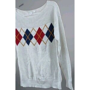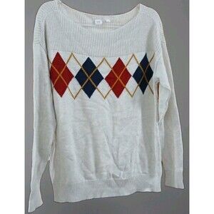 Classic GAP womens medium argyle knit sweater in cream with red, navy and mustard diamond pattern perfect for that preppy / Y2K / varsity academia vibe. Soft stretch knit, long sleeves, great for layering.