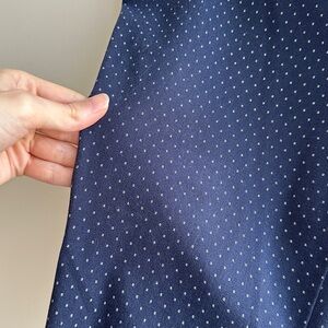 Stylish navy blue pants with a subtle polka dot pattern. Perfect for a smart-casual look.