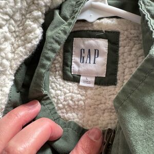 Embrace effortless style with this chic GAP military-inspired anorak jacket. The lush faux fur trimmed hood frames your face, inviting you into a cocoon of warmth on chilly days. Crafted in a classic olive green, this parka features a flattering drawstring waist that cinches to define your silhouette, complemented by the practical, yet stylish pocket placement. Picture yourself strolling through a vibrant autumn market or enjoying a crisp evening bonfire, wrapped in the comforting embrace of this versatile jacket.