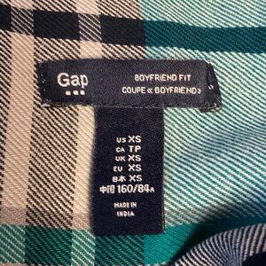 Chic plaid button-down shirt by GAP. Features a stylish green, black, and white pattern. Ideal for casual wear.