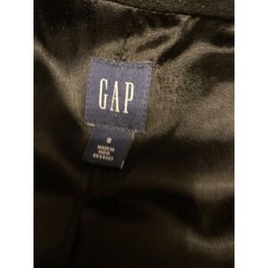 This is a pre-owned black wool blend coat from GAP, designed for women in size S. It features toggle buttons and a full zipper closure, with a collared point style and mid-length pea coat design. The coat is lined with acetate and has pockets, with a solid pattern and no character. It is recommended to be dry cleaned only. The coat is part of an unknown product line and was made in India. The coat has an American classic theme and model number 304027.