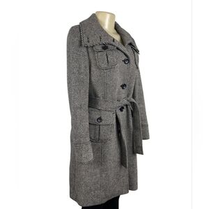 Chic trench coat with a classic herringbone pattern. Features button closure and waist tie. Ideal for layering. in perfect condition
