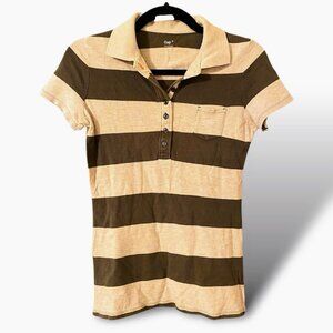 GAP Y2K Polo Shirt Womans S Green Tan Striped Classic Cap Sleeve Slim Fit EUC