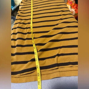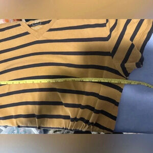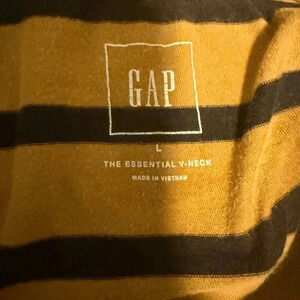 A classic short-sleeved tee in warm yellow and dark navy stripes, featuring a V-neck collar and a relaxed fit suitable for casual wear.
