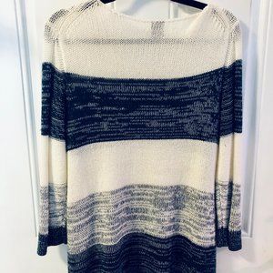 Lightweight, open weave sweater, 3/4 length sleeve, hi-low bottom 25" long in front, 27" long in back