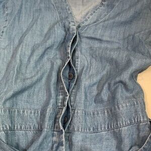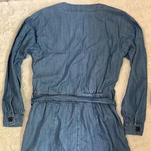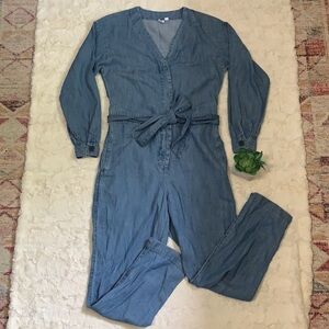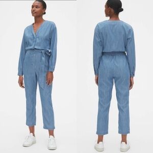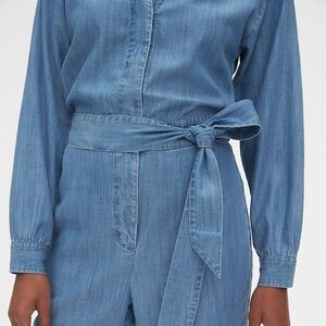 Like new Gap chambray jumpsuit. Medium wash. Straight silhouette with relaxed fit. Easy through hip and thigh. Slim leg opening, skims the ankle. Smooth lightweight tencel twill weave. Long sleeves, button cuffs. V-neck, concealed button front. Tie-belt at waist. Elastic waist in back. Front on seam pockets.