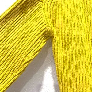 The sweater is a vibrant, solid yellow, resembling a mustard yellow hue.