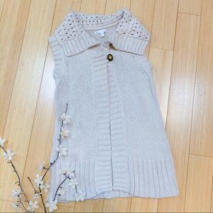Ivory cream colored sleeveless cardigan sweater vest by Gap, size small. Open knit large turnover collar, single button in the front. Cotton and rabbit hair blend makes this super soft. Very good pre-loved condition. Bust measures about 16 inches across unstretched, length about 25 inches.