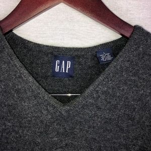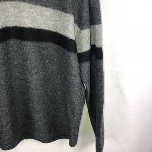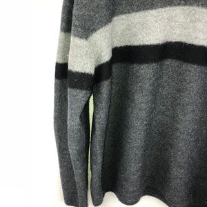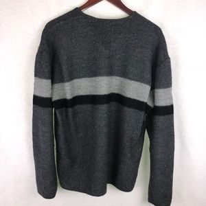 Nice dark gray wool sweater with light gray and black stripe. Good used condition with some areas of piling. This has a somewhat roomy fit.