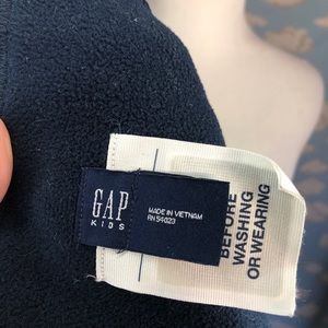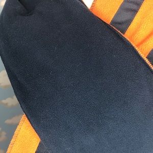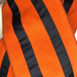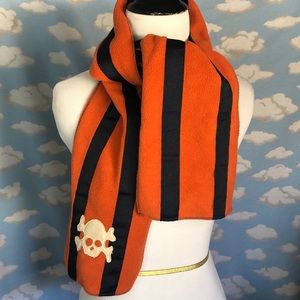 GapKids fleece scarf. Orange with navy grosgrain stripes and skull/crossbones appliqué. Opposite size navy blue fleece. Scarf is about 7” wide and 56” long. In excellent used condition.