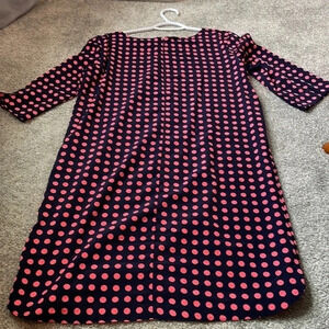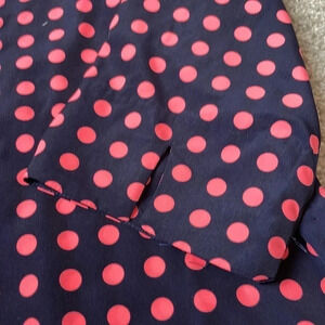 Preowned nice condition navy blue with hot pink polka dots. Half sleeves. 100% polyester. Cool and silky material. Size Medium.