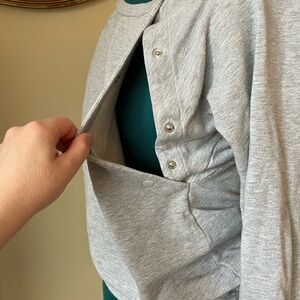 This sweatshirt has snaps on the front for breastfeeding / nursing access
