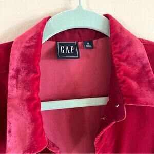 This is such a cute and classic red velvet button down blouse from the GAP. The top is solid red, such a soft velvet material (material tag is gone so I don’t know the exact makeup), has a collar, button down front and wrist, curved hem, size small. Perfect as we go into the fall and holidays. In excellent pre-owned condition, no flaws to note.