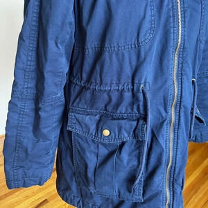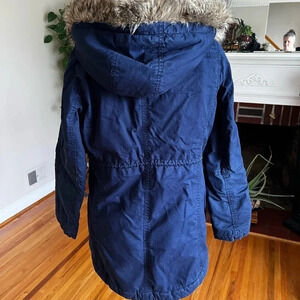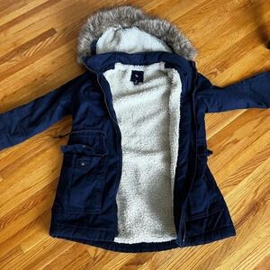 GAP sherpa lined jacket, size medium. Dark blue, cream sherpa & brown and black fur along the hood. Fur on the hood is removable. In good used condition, a small tear in the arm pit. Please see pictures.