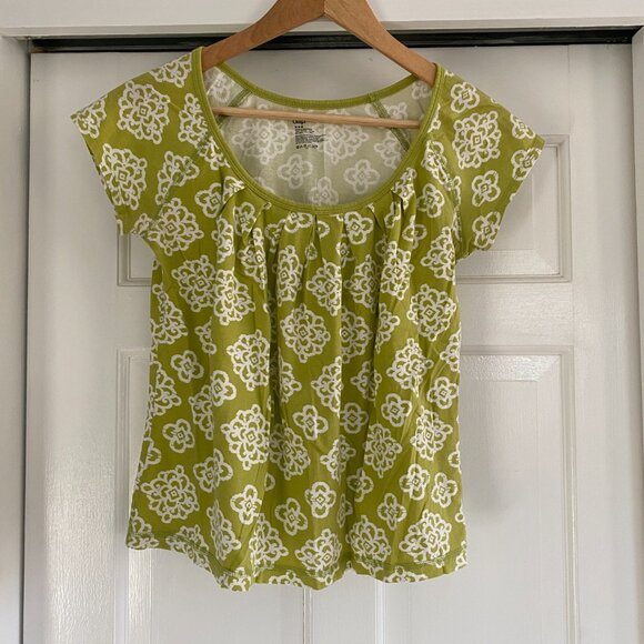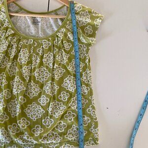 Chartreuse and white print 100% cotton. Scoop neck with front pleats. Good used condition.