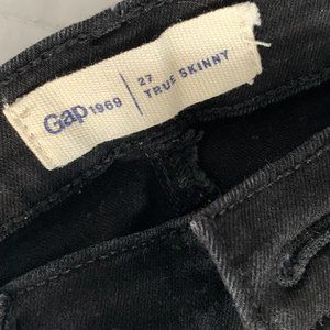 GAP true skinny ankle jean in black, ripped, stretchy, size 27. Washed black look. In good condition!